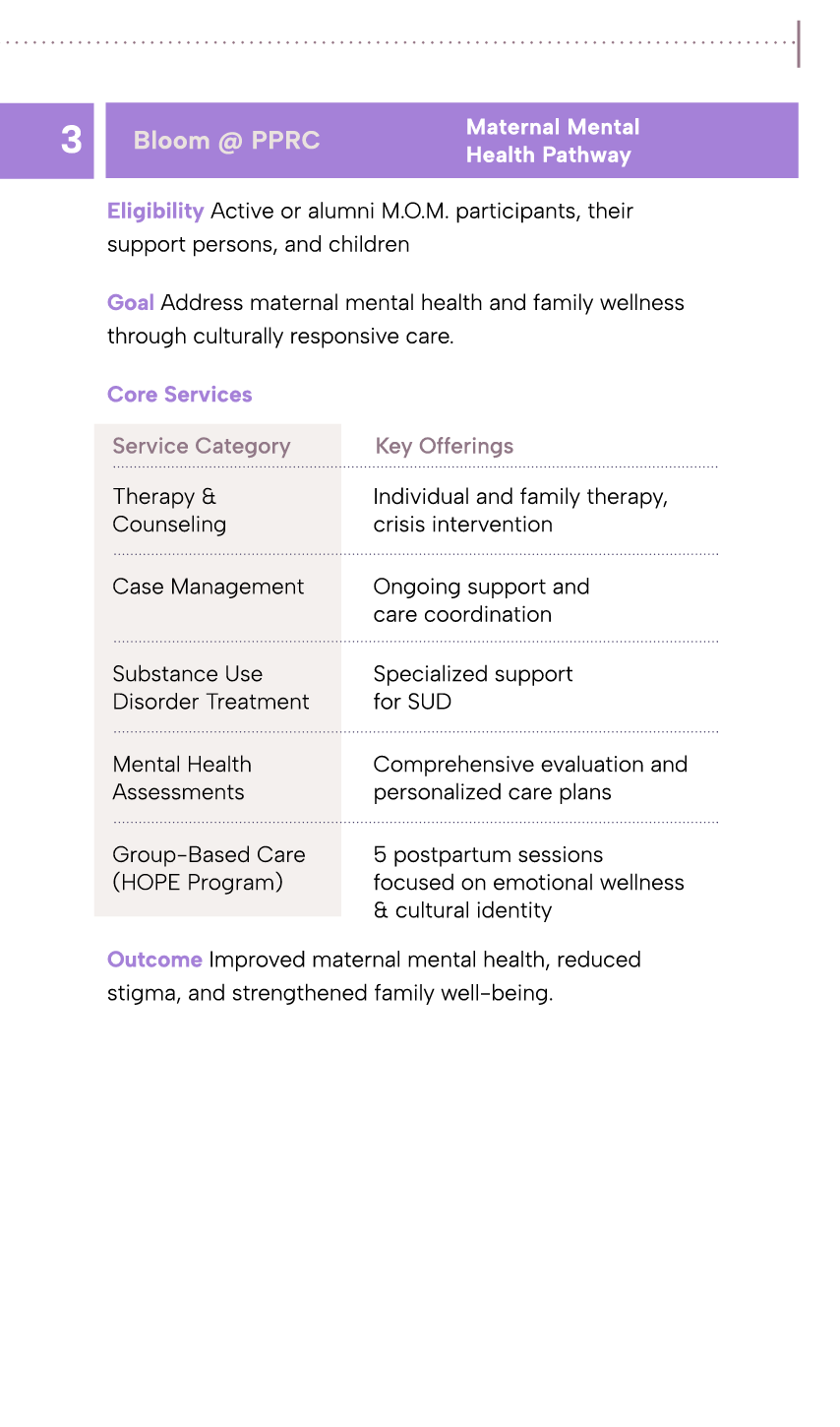 A mental health initiative for Pregnant with Possibilities Resource Center active clients, created to ensure that pregnant and postpartum individuals, their support persons, and children have access to culturally responsive mental health services that reduce barriers and stigma while prioritizing overall wellness.