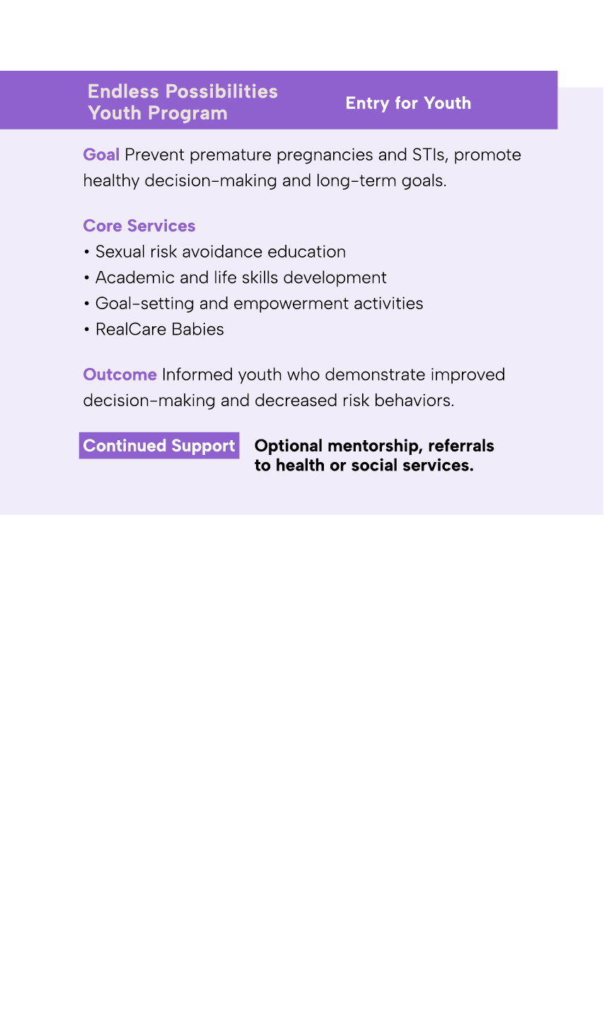 The Endless Possibilities Program is a 10-part, research-based curriculum designed to prevent premature pregnancies and STIs while addressing the root causes of health disparities, including academic challenges, relationships, self-esteem, and peer pressure.