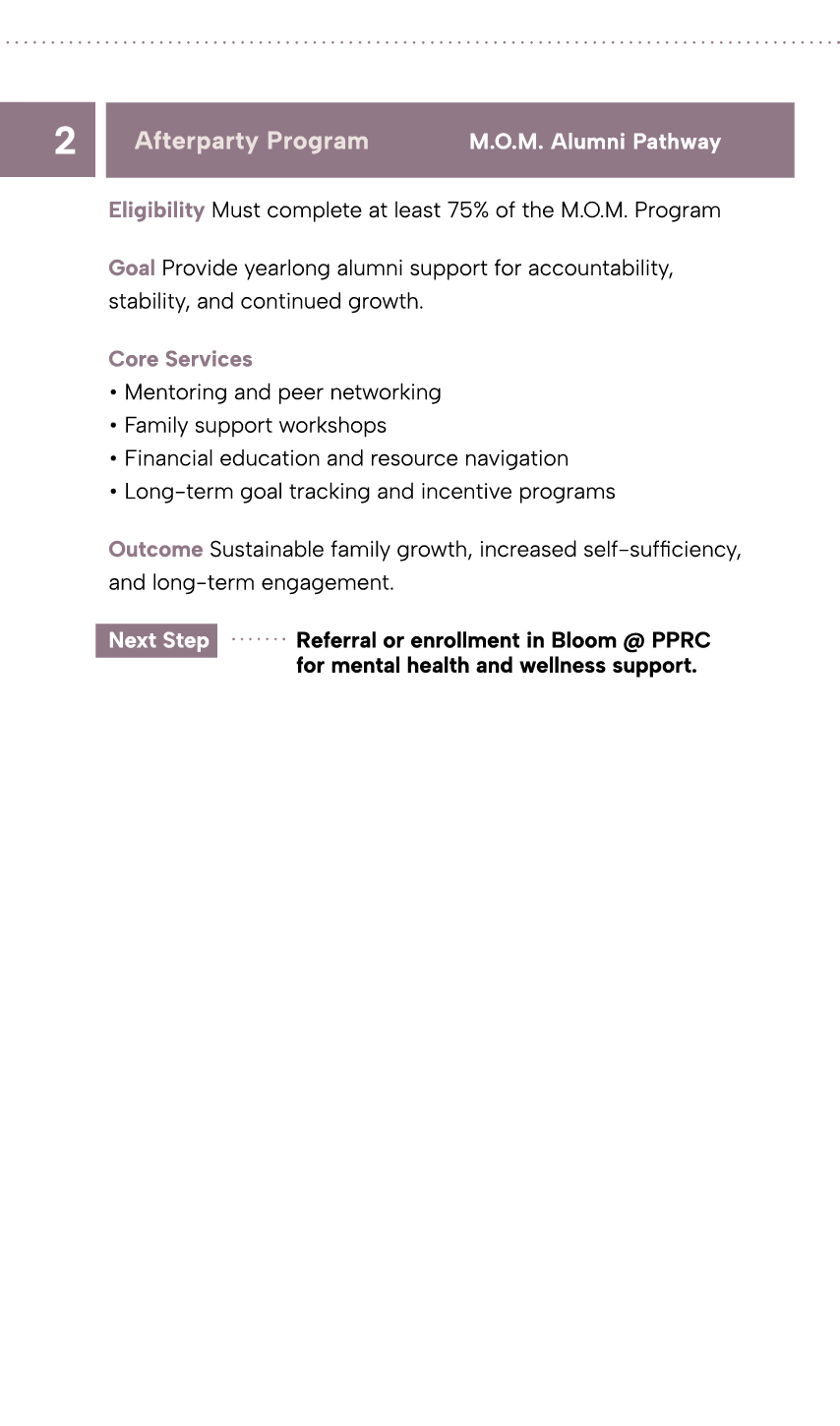 The Afterparty is a yearlong alumni program designed for M.O.M graduates, fostering accountability, stability, and growth beyond the perinatal period. Through ongoing mentorship, bi-monthly workshops, and financial support, participants continue their journey toward self-sufficiency and holistic wellness.