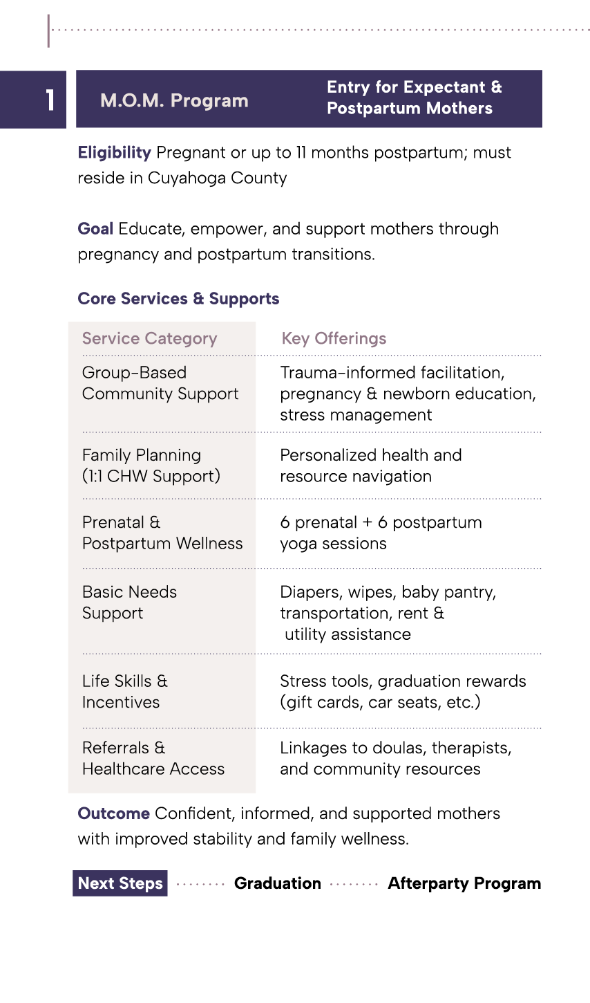 The M.O.M. Program is a 13-week hybrid series designed to educate, empower, and support pregnant and postpartum women in Cuyahoga County. With a trauma-informed facilitator and certified community health worker, participants receive culturally supportive group sessions and one-on-one guidance focused on healthy pregnancy, labor, stress management, breastfeeding, financial planning, relationships, and more.